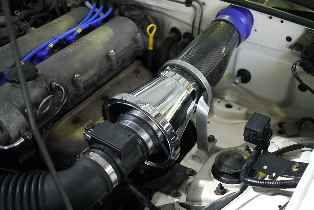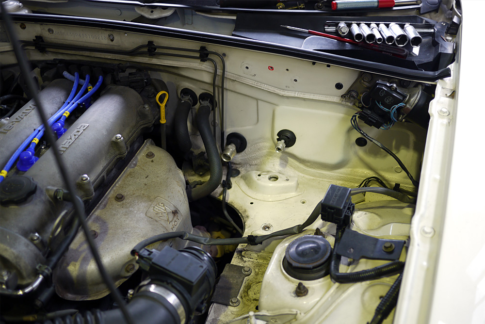 I bought a 2nd hand MX-5 Mania intake (same as on my old NA8C) so I had to drill a big hole in the firewall. Red marks the pilot hole (which was existing).