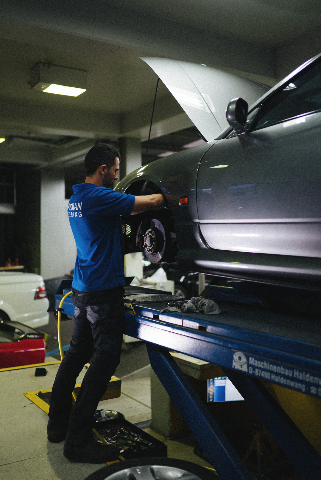 Technician Chris Vella adjusting the coils to raise the car up.