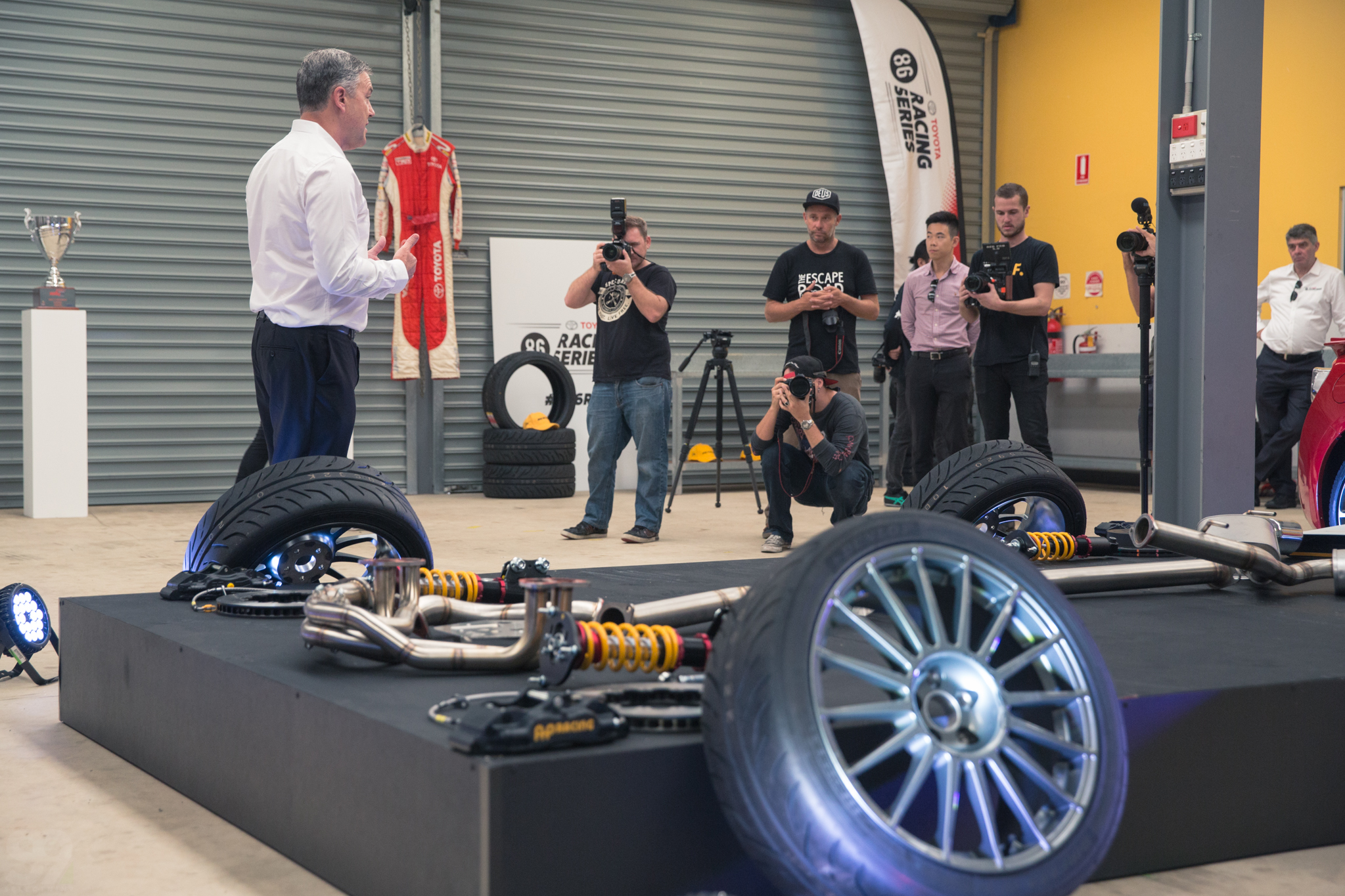 There were some pretty familiar faces present; Rusty, the Bates family, Neil Crompton, John Boston and a few of the guys from our community. After a quick presentation (the graphics package for this series is super slick!) we were ushered into the garage to check out the modifications done to each #T86RS race car. Interesting to see them put a lot of the money into AP Racing brakes, that’s exactly what we would do (the AP brakes on our GT-R has seen 3 track days without servicing!). Once Neil was done presenting the car we were invited to test drive a stock 86, then the #T86RS race car.