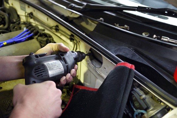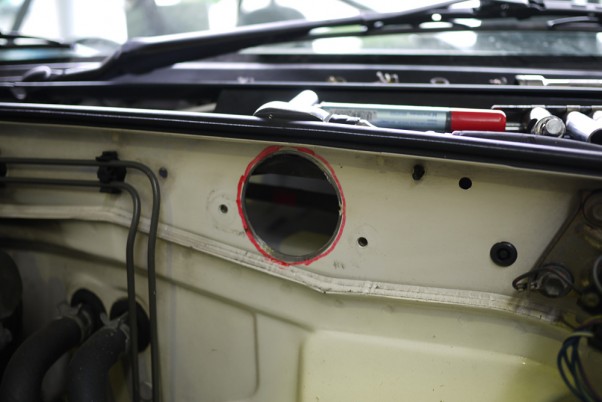I bought a 2nd hand MX-5 Mania intake (same as on my old NA8C) so I had to drill a big hole in the firewall. Red marks the pilot hole (which was existing).